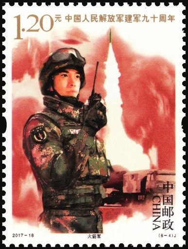 2017年8月1日中國郵政發(fā)行了2017-18《中國人民解放軍建軍九十周年》紀(jì)念郵票1套6枚,小型張1枚。圖案內(nèi)容分別為:陸軍、海軍、空軍、火箭軍、戰(zhàn)略支援部隊、武裝警察部隊,小型張內(nèi)容為聽黨指揮。該套郵票展現(xiàn)了中國人民解放軍的颯爽英姿和中國軍事作戰(zhàn)裝備的硬件實力,主題鮮明,磅礴大氣,畫面具有強(qiáng)烈的動感和威嚴(yán)的氣勢。小型張上軍旗飄揚(yáng),各軍種英姿颯爽,背景襯托各軍種高尖端裝備,描繪了我軍戰(zhàn)士聯(lián)合作戰(zhàn)的畫面,既表現(xiàn)了中國人民解放軍威武雄壯的軍容和現(xiàn)代化水平,也體現(xiàn)出黨的十八大以來,人民軍隊在新時代強(qiáng)軍目標(biāo)指引下所取得的巨大成就。
