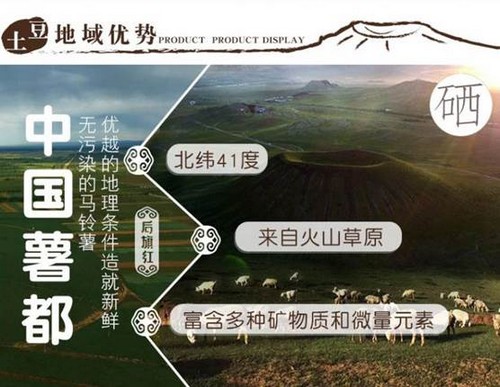 在這里種植土豆比起其他地區(qū)有著獨(dú)特的土壤優(yōu)勢,因?yàn)檫@里位于內(nèi)蒙古自治區(qū)的火山地質(zhì)公園—烏蘭哈達(dá)火山群,覆蓋著馬鈴薯優(yōu)勢區(qū),在這里盛產(chǎn)的馬鈴薯有“皮紅、內(nèi)黃、質(zhì)綿口香”的特點(diǎn),被人們譽(yù)為“火山滋養(yǎng)的綠色食品”。