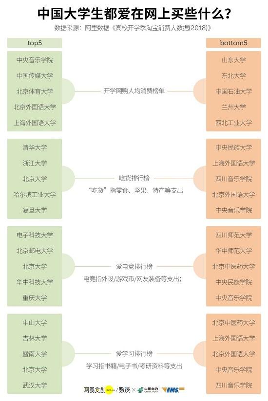 根據(jù)往年的數(shù)據(jù),大學開學季,中國高校大學生網(wǎng)購消費,往往會達到一個小高峰。阿里數(shù)據(jù)則顯示,開學網(wǎng)購人均消費高校榜單中,中央音樂學院、中國傳媒大學、北京體育大學,以最高的人均消費排名前三。