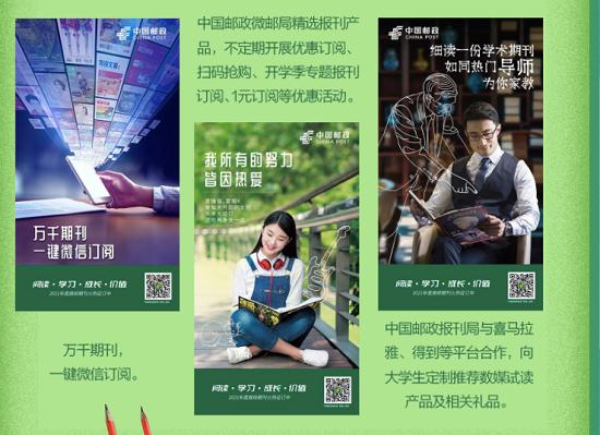 面對高校學生,還有各類文藝雜志、報刊優(yōu)惠訂閱服務,萬千期刊,均能微信一鍵訂閱。中國郵政微郵局精選報刊產(chǎn)品,更是不定期開展優(yōu)惠訂閱、掃碼搶購、開學季專題報刊訂閱、1元訂閱等優(yōu)惠活動!甚至還聯(lián)合喜馬拉雅、得到等平臺,提供數(shù)媒試讀和相關禮品,可以說是誠意滿滿。