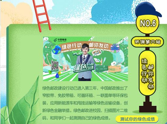 加油第六站,中國郵政倡導和大家一起實行綠色郵政,共創(chuàng)綠色家園。在推廣綠色郵政的三年中,中國郵政圍繞21項環(huán)保指標,不斷升級,比如提供窄膠帶、免膠箱,使用環(huán)保材料,進行環(huán)保投遞,綠郵行動,郵你發(fā)動,快來一起測測你的綠色成績!