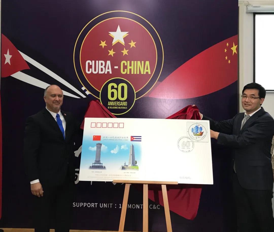 9月28日是中國古巴建交60周年紀(jì)念日。古巴駐華大使館舉行慶祝招待會,國務(wù)委員兼外長王毅出席。為了紀(jì)念這個特殊的日子,中國集郵總公司特發(fā)行外交紀(jì)念封一枚。招待會上,中國郵政集團有限公司總經(jīng)理張金良與古巴駐華大使佩雷拉共同為紀(jì)念封揭幕,張金良代表中國郵政集團有限公司向古巴大使館贈送紀(jì)念封。
