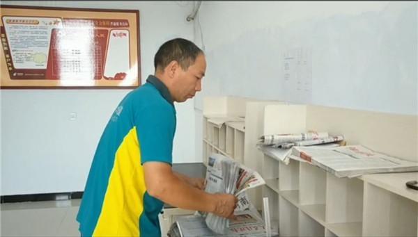 在獅豹頭鄉(xiāng)郵政支局的一間大屋子里,報刊、信件的分揀對閆見海來說輕車熟路?!胺謷罂耐瑫r,我就把報紙翻看完了,路上遇到村民會問我,‘今天有啥新聞’,我就說給他們聽?!遍Z見海笑著,將報刊分裝進(jìn)一個褡褳樣的郵包里,斜挎在肩上。