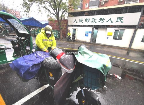 朝陽(yáng)區(qū)今天早上就發(fā)布了道路結(jié)冰黃色預(yù)警,提醒市民外出一定要注意安全。這樣的天氣,一方面要注意交通安全,另一方面更要保護(hù)包裹和報(bào)刊不被雨淋雪濕。為此,北京郵政朝陽(yáng)區(qū)分公司各個(gè)單位加強(qiáng)了安防措施,通過(guò)班前會(huì)提醒、重點(diǎn)人提示、檢查車(chē)輛安全、加發(fā)防雨用具等措施,以確保郵路安全暢通。一大早,甜水園營(yíng)業(yè)部就在大院內(nèi)支起了帳篷,要求大家在帳篷內(nèi)分揀郵件,帳篷里放不下了,大家就搶著郵件一路小跑往室內(nèi)運(yùn)送,為的是不讓包裹淋濕。