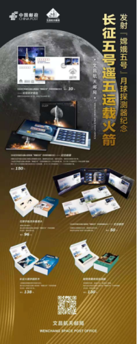 文昌航天主題郵局同步發(fā)行了《長(zhǎng)征五號(hào)遙五運(yùn)載火箭發(fā)射“嫦娥五號(hào)”月球探測(cè)器紀(jì)念》郵資封片組合、郵折、郵冊(cè)等系列郵品。