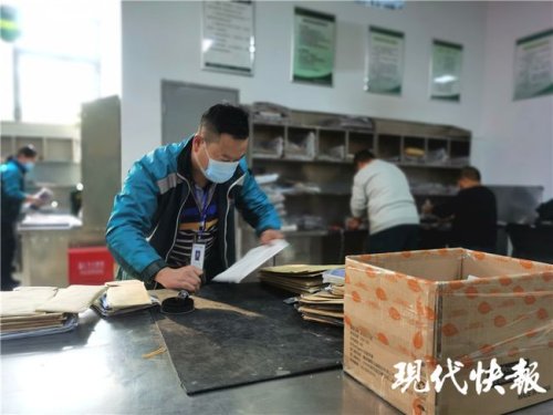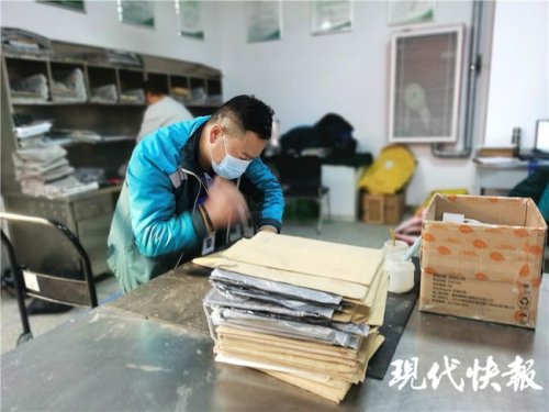 12月8日上午9點(diǎn),現(xiàn)代快報(bào)記者走進(jìn)宿遷市郵政城區(qū)分公司時(shí),李元明正忙著給一批已經(jīng)分類好的郵件和包裹蓋上郵戳?!芭九九九尽彪S著一聲聲脆響,摞得小山一樣高的包裹很快就被處理好,速度快得像是開了三倍速一般。