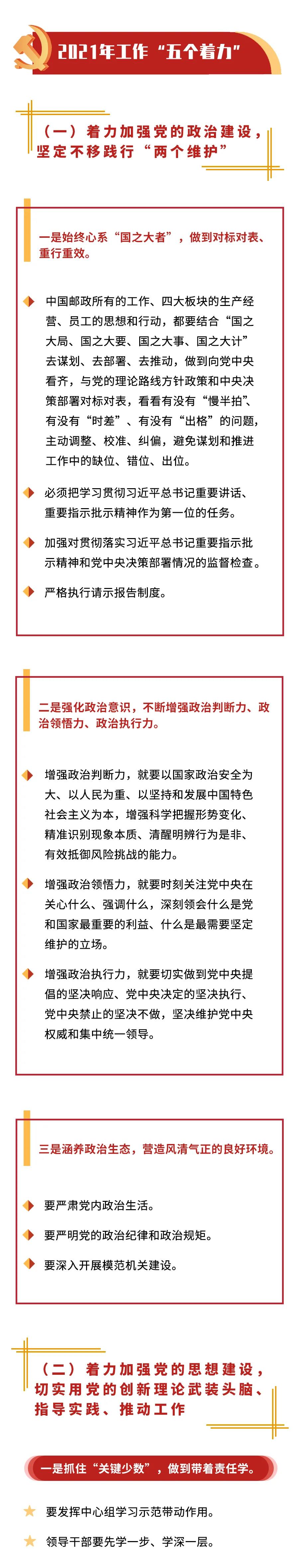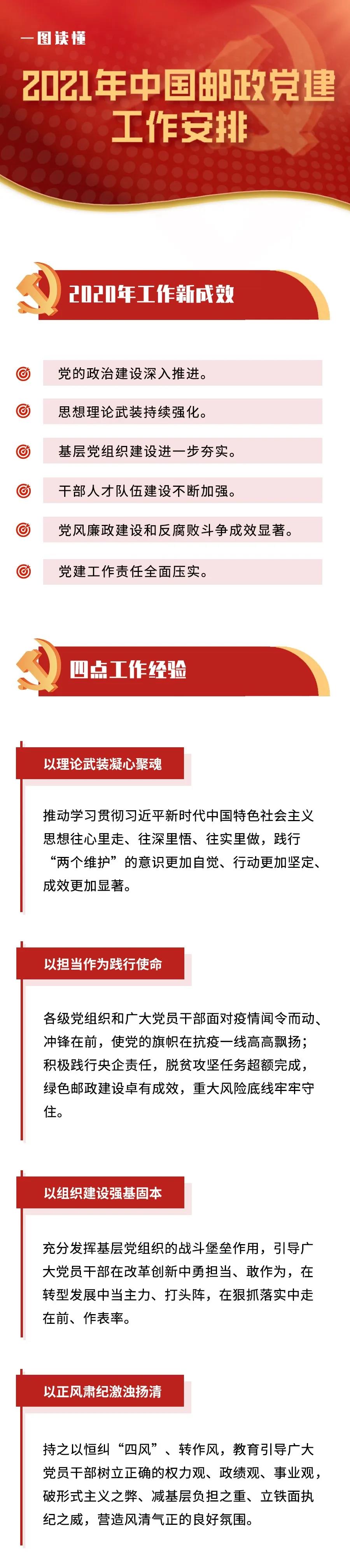 1月28日,2021年中國郵政集團(tuán)有限公司黨的建設(shè)暨黨風(fēng)廉政建設(shè)和反腐敗工作會議召開。這次會議是在中國郵政立足新階段、邁向新征程的重要時(shí)刻提升政治站位、激發(fā)擔(dān)當(dāng)作為、凝心聚力推動發(fā)展的一次政治動員。會議總結(jié)2020年中國郵政黨的建設(shè)以及黨風(fēng)廉政建設(shè)和反腐敗工作,部署2021年重點(diǎn)任務(wù),提出把2021年作為“黨建質(zhì)量提升年”,以高質(zhì)量黨建引領(lǐng)高質(zhì)量發(fā)展,為打造“六維共生”的新郵政、推動中國郵政二次崛起提供堅(jiān)強(qiáng)政治保證。