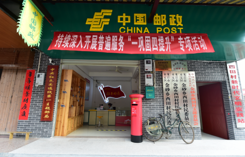 剛一走進離伯公凹不遠的金砂紅色小鎮(zhèn),就能感受到濃烈的紅色文化氛圍——街道兩邊高高掛著紅旗,建筑上隨處可見五角紅星。“中央紅色交通線”第一主題郵局就位于小鎮(zhèn)的中心位置,主題郵局門口有一個格外顯眼的紅色郵筒。