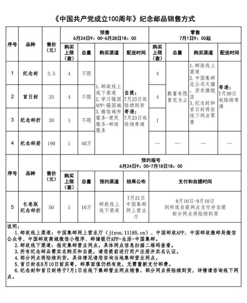 為滿足廣大用戶需求,紀(jì)念郵品將采取實(shí)名制預(yù)售、預(yù)約搖號(hào)及零售方式進(jìn)行銷售?,F(xiàn)就有關(guān)事項(xiàng)公告如下:
