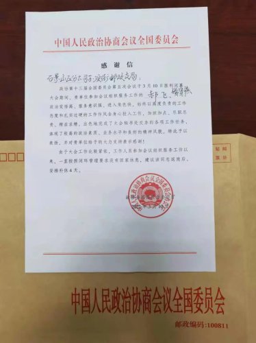 3月10日,中國人民政治協(xié)商會議全國委員會辦公廳向石景山區(qū)分公司寄來感謝信,對郵政兩會服務工作給予充分肯定和衷心感謝。信中表示,石景山區(qū)分公司郝飛、張宇燕同志在大會期間加班加點,恪盡職守、熱情服務,出色地完成大會秘書處交辦的各項工作任務。