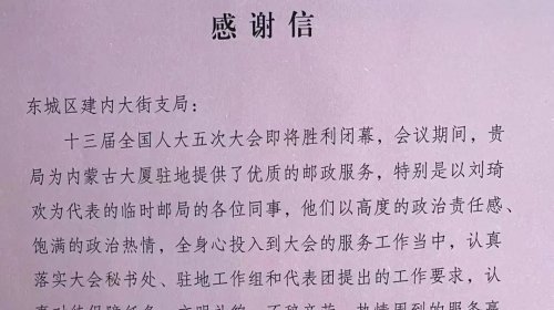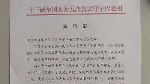 遼寧代表團在感謝信中提到,“建內大街支局秉承‘人民郵政為人民’的服務宗旨,為廣大代表提供了優(yōu)質、高效、務實的用郵服務和豐富的郵政產品,受到了與會代表和工作人員的認可和贊許,投遞員清晨就將當天的會議用報及郵件送到駐地,保證了時限。在此向中國郵政致以誠摯的感謝,并提出表揚!”