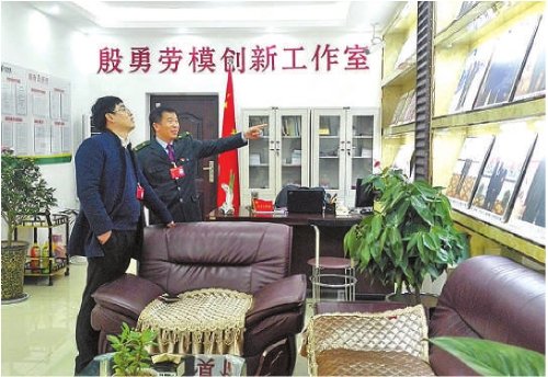 殷勇(右)向時任泗洪縣檢察院檢察長介紹“殷勇勞模創(chuàng)新工作室”,并對檢察工作建言獻策