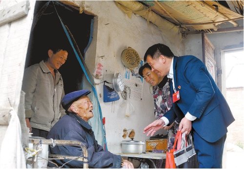殷勇(右一)到農戶家中走訪,為老人送去慰問品