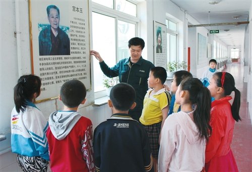 王明杰向葦沙河鎮(zhèn)小學的同學講述郵政“鐵人”宮本玉的事跡?!跬跫抑?攝