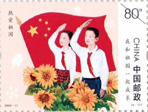 6月1日,《我和祖國(guó)一起成長(zhǎng)》特種郵票發(fā)行。該郵票一套5枚,郵票圖案名稱分別為《熱愛(ài)祖國(guó)》《刻苦學(xué)習(xí)》《崇尚科學(xué)》《強(qiáng)健體魄》《尊重勞動(dòng)》。