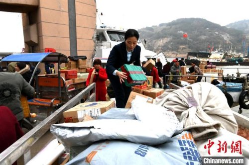 船一到,在碼頭等待已久的蔣玉美就熟練地從隨船貨物中,挑選出屬于郵政公司的郵件和包裹?!敖裉煊?00多件,大多是村民網(wǎng)購的生活用品?!笔Y玉美稱,每天一班的客船在中午到達(dá),她就會到碼頭接收,分揀后進(jìn)行投遞。