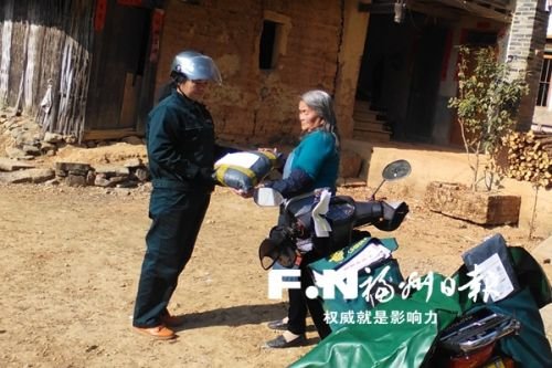 閩清縣上蓮鄉(xiāng)的高山上,一座簡陋的土墻瓦房前駛來一輛摩托車,身穿綠色工服的女郵遞員支好車,將一個包裹遞給住在這里的一位老奶奶。包裹里,是老奶奶的晚輩為她網(wǎng)購的日用品。
