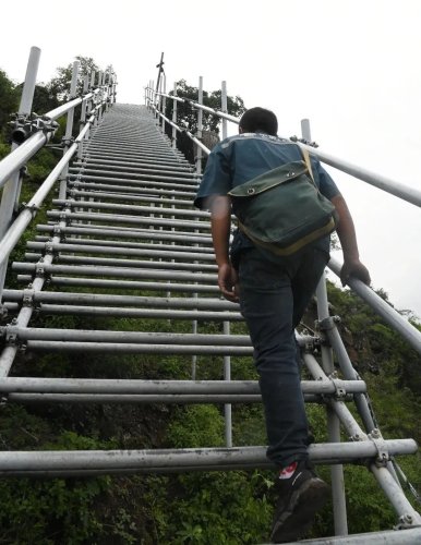 沿著石土混合的臺(tái)階而上,一會(huì)兒功夫,一段段鋼架搭成的鋼梯就映入眼簾,只見(jiàn)梯子每一級(jí)由2-3根獨(dú)立的鋼管焊接而成,鋼管圓圓的,感覺(jué)稍不留神很容易踏空和滑倒。