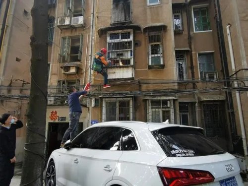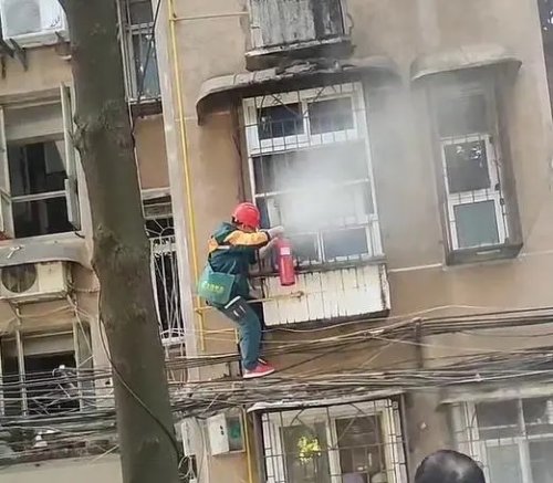 送報(bào)時(shí)偶遇起火,郵政投遞員接過(guò)社區(qū)人員的滅火器爬窗撲滅