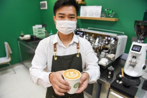 2月15日,在深圳咖啡主題郵局,咖啡師展示剛制作完成的拿鐵。新華社記者 毛思倩 攝