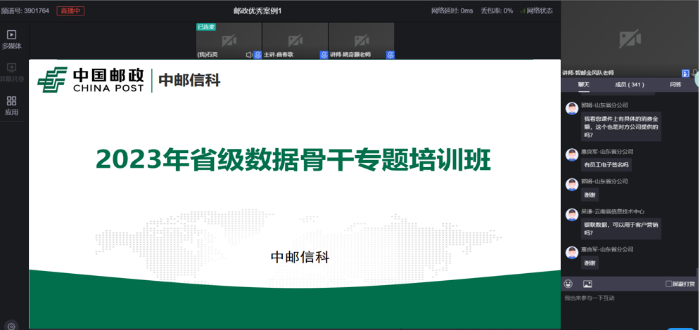 首次培訓(xùn)已于4月19日下午舉行,培訓(xùn)時(shí)長(zhǎng)2.5小時(shí),培訓(xùn)內(nèi)容為2022年數(shù)據(jù)創(chuàng)新勞動(dòng)賽優(yōu)秀案例,共三個(gè),分別是《寄遞業(yè)務(wù)客戶資費(fèi)風(fēng)險(xiǎn)管理模型》《風(fēng)險(xiǎn)防控方向智慧風(fēng)控體系下金融員工道德風(fēng)險(xiǎn)識(shí)別》《郵政農(nóng)品數(shù)字化運(yùn)營(yíng)與智能營(yíng)銷》,來自郵儲(chǔ)總行、中郵消費(fèi)等多家單位,各省數(shù)據(jù)中心、信息技術(shù)中心和部分地市數(shù)據(jù)條線的骨干共計(jì)340余人參加了此次培訓(xùn)。