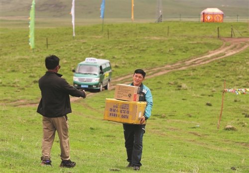 看到郵車(chē)來(lái)了,牧民迫不及待地迎上去接過(guò)自己網(wǎng)購(gòu)的商品?!酢豆と巳?qǐng)?bào)》記者 王偉偉 攝
