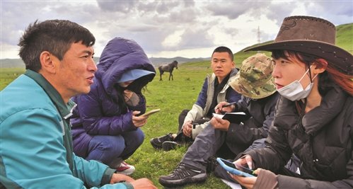 投遞間隙,哈弄奪機(jī)在草原上席地而坐,接受記者聯(lián)訪?!踔袊?guó)郵政報(bào)記者 張晨昱 攝