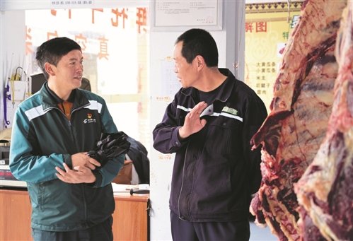 哈弄奪機(jī)向牦牛肉商戶(hù)了解最新的市場(chǎng)行情?!跣氯A社記者 李賀 攝