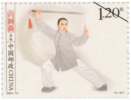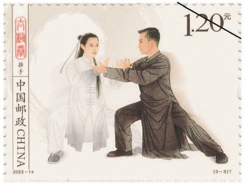 該套郵票一套3枚,圖案內(nèi)容分別為拳術(shù)、器械、推手。郵票采用工筆人物形式表現(xiàn),整體色調(diào)以黑白灰為主,背景采用水墨飛白映襯太極拳平和、包容、大道至簡的意境。第一枚郵票表現(xiàn)了一位白發(fā)長須老者,正氣定神閑地做著太極拳單鞭動作,體現(xiàn)出太極拳的傳統(tǒng)風范和延年益壽的作用。背景用揮灑自如的水墨筆觸和肌理來表現(xiàn),伴隨老者動作產(chǎn)生無形氣韻。第二枚郵票中是一位英姿颯爽的舞劍女子,背景中如影隨形的氣流若隱若現(xiàn),體現(xiàn)出太極劍行云流水的特點。第三枚郵票中是一對進行太極拳推手的男女青年,一男一女、一黑一白象征太極的陰陽相濟,背后的水墨肌理隱約形成陰陽的概念,刻畫出“陰陽太極本相隨、動靜虛實把手推”的場景。