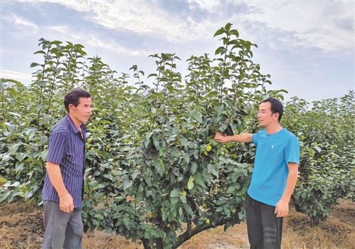 丁丹偉(右)在了解果樹長勢時與農戶交談。