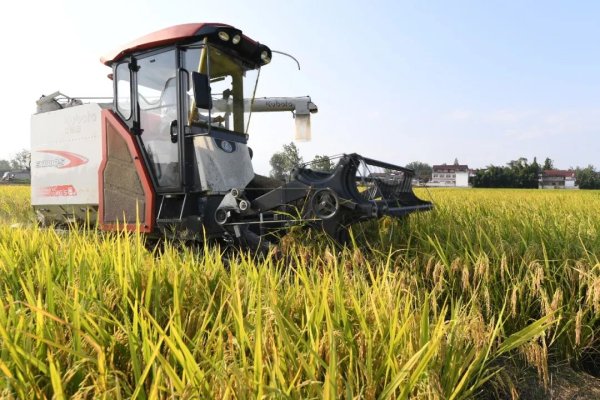 大型聯(lián)合收割機(jī)在稻田里收割