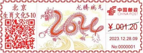 為迎接甲辰龍年,在生肖文化主題郵局即將踏入第四個年頭,特別推出“龍騰瑞氣”郵資機宣傳戳一枚,同圖文化日戳和美術封也同時亮相。據悉,此枚文化日戳為北京首枚龍題材的文化郵戳。