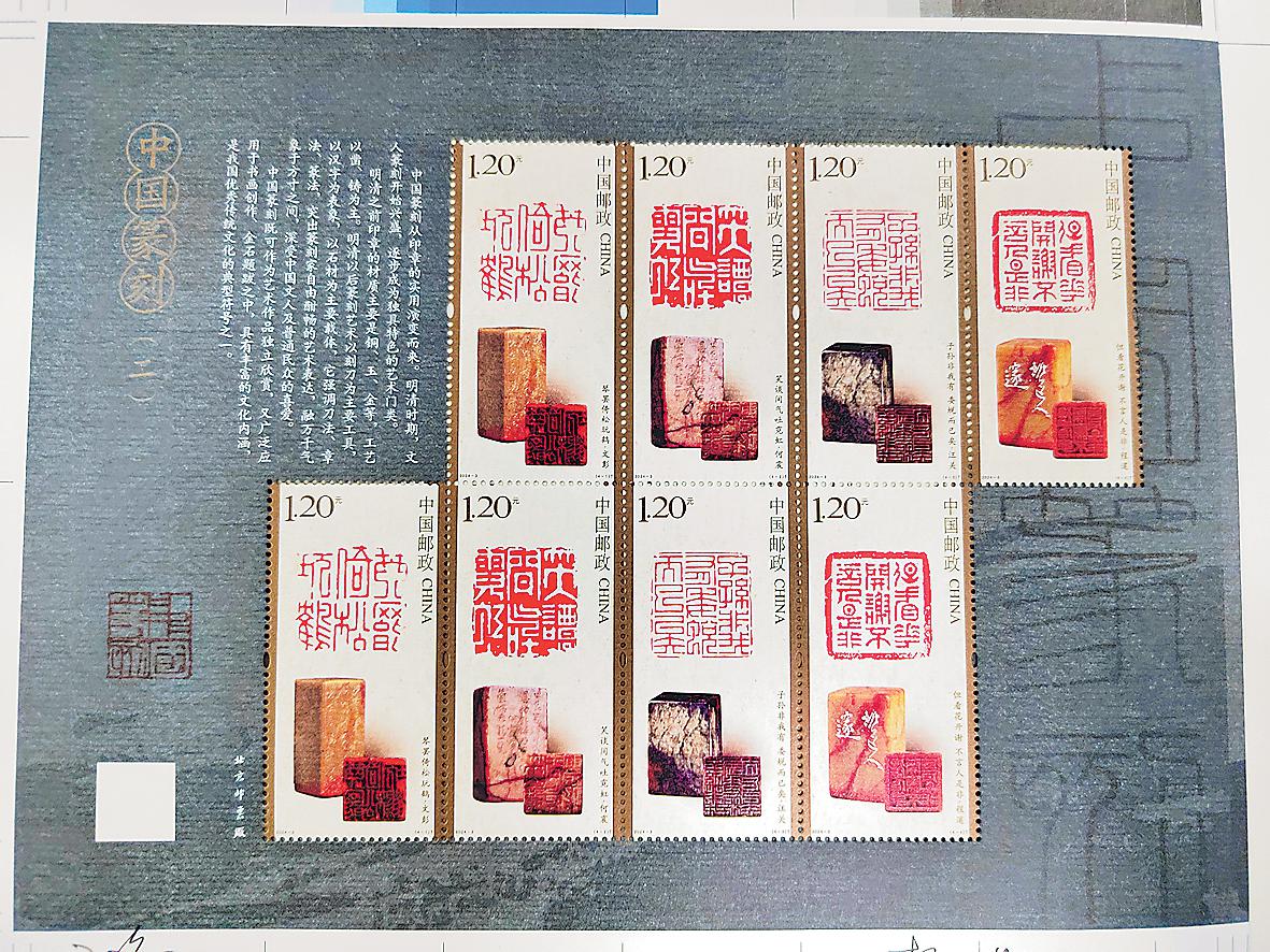 《中國篆刻(二)》特種郵票以獨特的印制工藝、特殊的油墨效果,加上細(xì)膩的宣紙質(zhì)地,讓集郵愛好者在觀賞郵票時,感受到鈐印過程中“紋理盡合,似蟬蟲脫蛻”的獨特質(zhì)感。