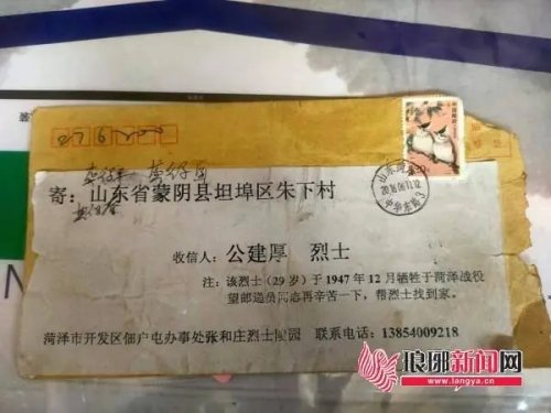 那是2016年6月13日,王德建在對(duì)照清單進(jìn)行勾挑核對(duì)信件時(shí),發(fā)現(xiàn)了一封特別的信件。信封上印著“尋找烈士”四個(gè)鮮紅大字,寄信人是一位幫助烈士尋親的志愿者——菏澤市經(jīng)濟(jì)開(kāi)發(fā)區(qū)佃戶(hù)屯街道辦事處張和莊社區(qū)黨支部書(shū)記張景憲,收件地址是“蒙陰縣坦埠區(qū)朱下村”,收件人是“公建厚烈士”,下邊還標(biāo)注著一行小字:該烈士(29歲)于1947年12月?tīng)奚诤蕽蓱?zhàn)役,望郵遞員同志再辛苦一下,幫烈士找到家。