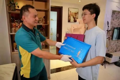 7月10日下午1點,2024年江蘇全省首封高考錄取通知書花落常州。中國郵政常州市分公司天寧攬投部投遞員、“常州市五一勞動獎?wù)隆鲍@得者徐大磊冒雨僅用20分鐘,將北京航空航天大學的錄取通知書送達考生賈沐洋手中,并向他表示祝賀。