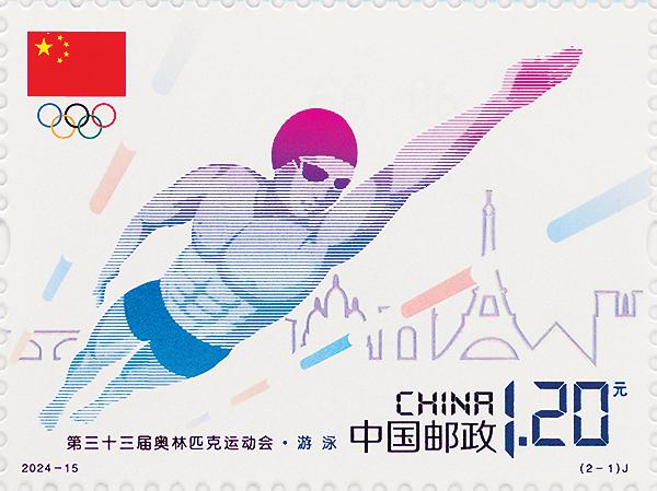 第三十三屆奧林匹克運(yùn)動會將于法國巴黎當(dāng)?shù)貢r間2024年7月26日開幕,8月11日閉幕。這是整整一個世紀(jì)后,奧運(yùn)會重回巴黎,法國首都將成為繼倫敦之后第二座三次舉辦夏奧會的城市。該套郵票共2枚,郵票圖案名稱為《游泳》《攀巖》。郵票采用簡約、概括的圖形化設(shè)計方式,展現(xiàn)兩項(xiàng)運(yùn)動的精彩瞬間。郵票第1枚《游泳》(見下圖)表現(xiàn)了男子自由泳的形象,畫面采用從水中仰視的角度,展現(xiàn)運(yùn)動員劈波斬浪、奮力向前的姿態(tài)。郵票第2枚《攀巖》表現(xiàn)了女子速度攀巖的形象,畫面采用斜側(cè)視角,展現(xiàn)運(yùn)動員抬腿踩點(diǎn)、向上攀拉的動作。兩枚郵票的畫面背景為埃菲爾鐵塔等巴黎城市建筑,體現(xiàn)了本屆奧運(yùn)會的地域特色。該套郵票結(jié)合高精度膠版印刷工藝,整體畫面色彩明亮、充滿活力,邊飾漸變過渡自然,同時輔以局部燙印工藝,點(diǎn)亮主題背景,增強(qiáng)畫面動感。