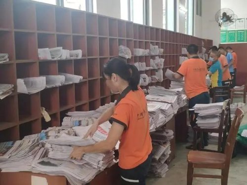 在澄邁縣郵政分公司郵件處理中心,分揀和投遞人員加班加點,集體投入臺風期間停運的報紙分發(fā)和投遞工作中,確保第一時間將報紙投遞上門,展現(xiàn)郵政速度。