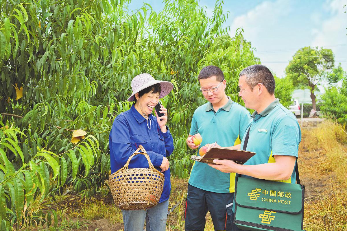 郵政入黨積極分子走訪水蜜桃種植戶,了解農(nóng)戶產(chǎn)量和寄遞需求。
