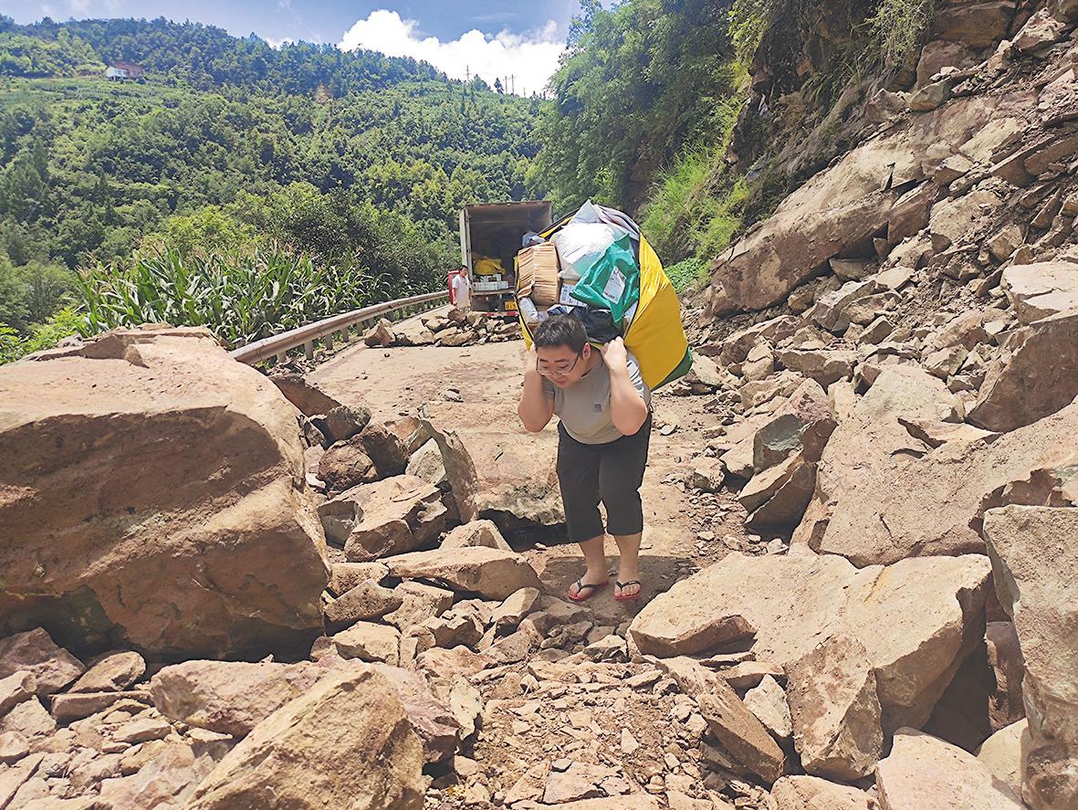 因山體滑坡、道路塌方造成郵路中斷,郵政員工接力背運傳遞郵件?!跣ね窬z
