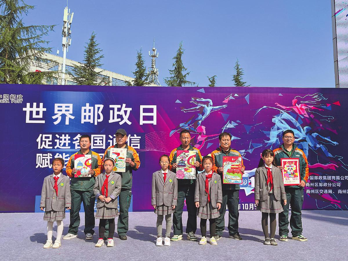 陜西省商洛市郵政分公司舉辦世界郵政日宣傳暨“童心同行 郵政相伴為美好生活加‘郵’”活動,來自商州區(qū)第六小學的5位小朋友現(xiàn)場為郵政快遞員送上了精美的手繪作品?! 鯊垶t 攝