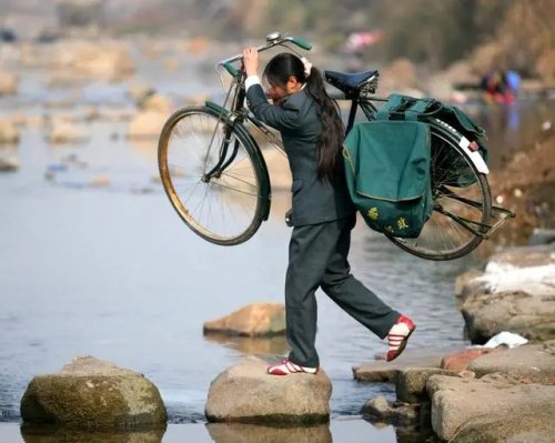 2007年1月,郵遞員羅細英從陳坊鄉(xiāng)出發(fā)前往鎖子橋村(自然村)送信件和報刊,為了趕時間、抄近路,就扛著自行車過河。跟隨采訪的新華社記者在河邊拍下了這張照片。如今,老照片拍攝地的小河溝上已建起了公路橋。