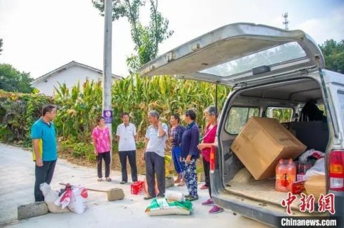 黃德印(左一)為村民帶來物資。張倩龍 攝