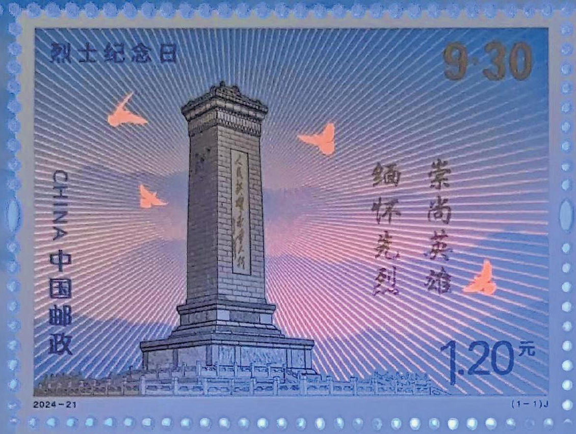 《烈士紀(jì)念日》紀(jì)念郵票使用膠雕聯(lián)合印刷,采用一版雙色雕刻工藝。其中,用黑色雕刻展示人民英雄紀(jì)念碑的莊嚴(yán)和厚重,同時(shí)采用特種雕刻閃金油墨雕刻“緬懷先烈崇尚英雄”八個(gè)大字。在陽(yáng)光下觀察,閃亮的金色文字光澤奪目、熠熠生輝,配以膠印細(xì)膩、柔和的漸變背景圖案,使膠印、雕刻兩種方式發(fā)揮出最佳表現(xiàn)力。