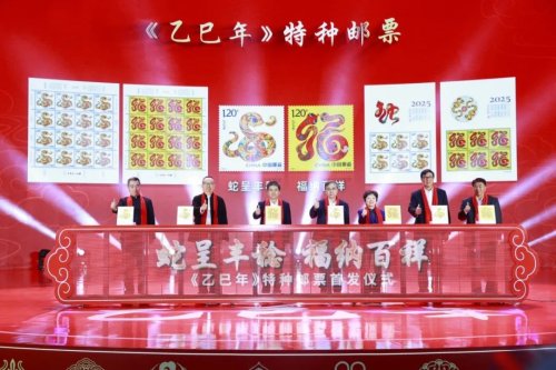 蛇呈豐稔、福納百祥。1月5日,《乙巳年》特種郵票首發(fā)儀式在國家科技傳播中心隆重舉行。