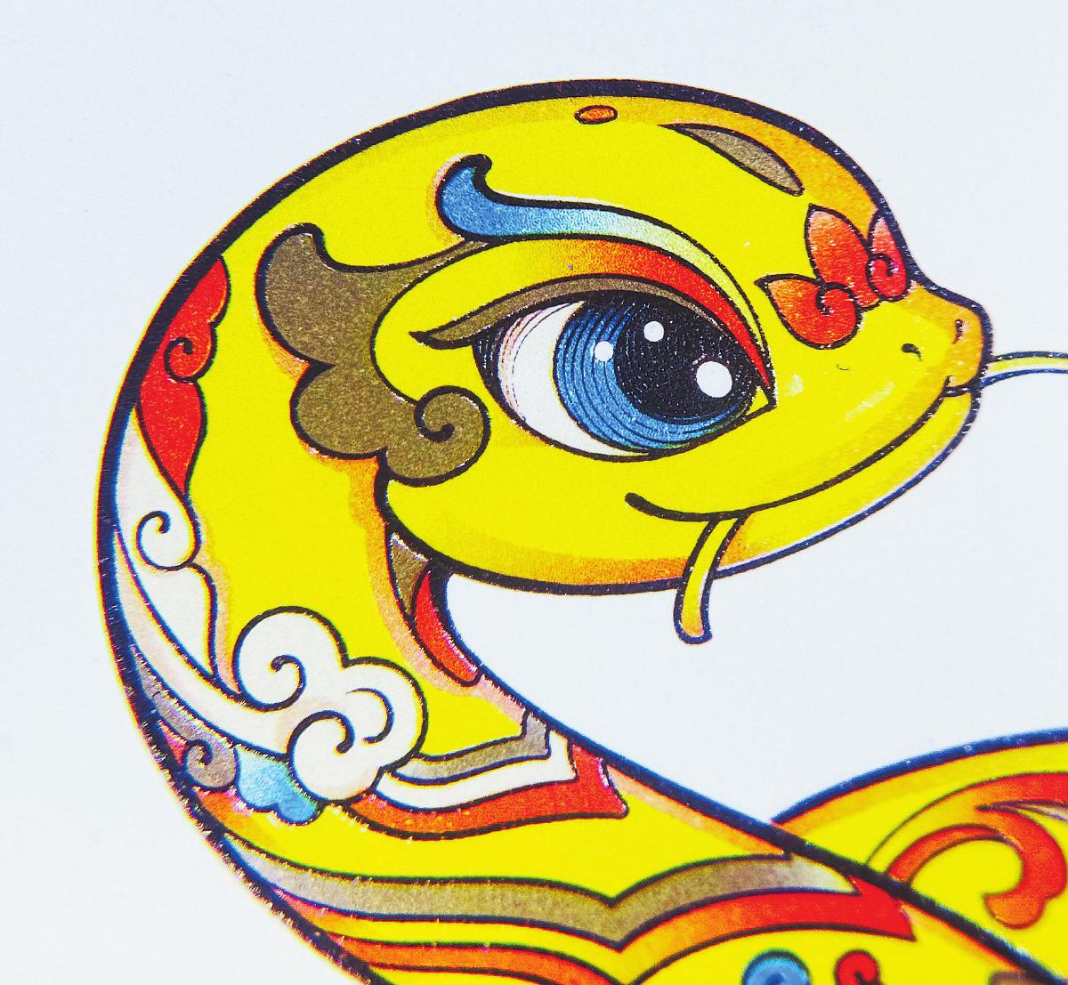 在該套郵票的工藝設(shè)計(jì)方面,北京郵票廠沿襲第四輪生肖郵票的整體工藝設(shè)計(jì)思路,采用膠雕聯(lián)合印刷方式,使用六色高精度膠印以及由雕刻師采用獨(dú)特的中國(guó)畫白描技法配合特種棕色雕刻工藝印制。其中,在雕刻布線時(shí)使用中國(guó)畫白描技法,線條的描繪準(zhǔn)確而流暢,顯著提升圖案的整體精細(xì)度和藝術(shù)感。在第一枚“蛇呈豐稔”中,通過中國(guó)畫白描技法的精細(xì)描繪,蛇和“嘉禾”這一形象更加醒目、突出,寓意著豐收和富足。在第二枚“福納百祥”中,蛇身構(gòu)成的“福”字通過中國(guó)畫白描技法得到了更加細(xì)膩的描繪,變得更加清晰、立體,寓意著團(tuán)圓和幸福。采用國(guó)際先進(jìn)的激光雕刻機(jī)刻版,通過線條的粗細(xì)、深淺變化,表現(xiàn)出圖案的層次感和立體感,使得郵票圖案中的蛇身、蛇鱗以及周圍的裝飾元素都得到更加生動(dòng)的呈現(xiàn),整個(gè)畫面因此更加飽滿、立體。