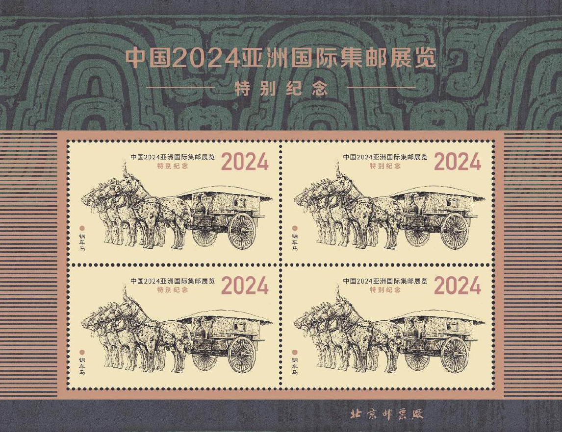 主圖選定后,北京郵票廠設(shè)計(jì)師夏競秋負(fù)責(zé)紀(jì)念張的整體設(shè)計(jì)工作。整版紀(jì)念張采用四方聯(lián)的雙聯(lián)張形式,首次以帶測控條的完整原始印張呈現(xiàn)。作為《中國2024亞洲國際集郵展覽》紀(jì)念郵票第1枚“鼎啟新章”的設(shè)計(jì)者,夏競秋選用上海博物館鎮(zhèn)館之寶——大克鼎器身花紋作為邊飾,色彩厚重古樸,與主體銅車馬雕刻圖案相互襯托,互為呼應(yīng),彰顯出濃重的歷史文化特色。