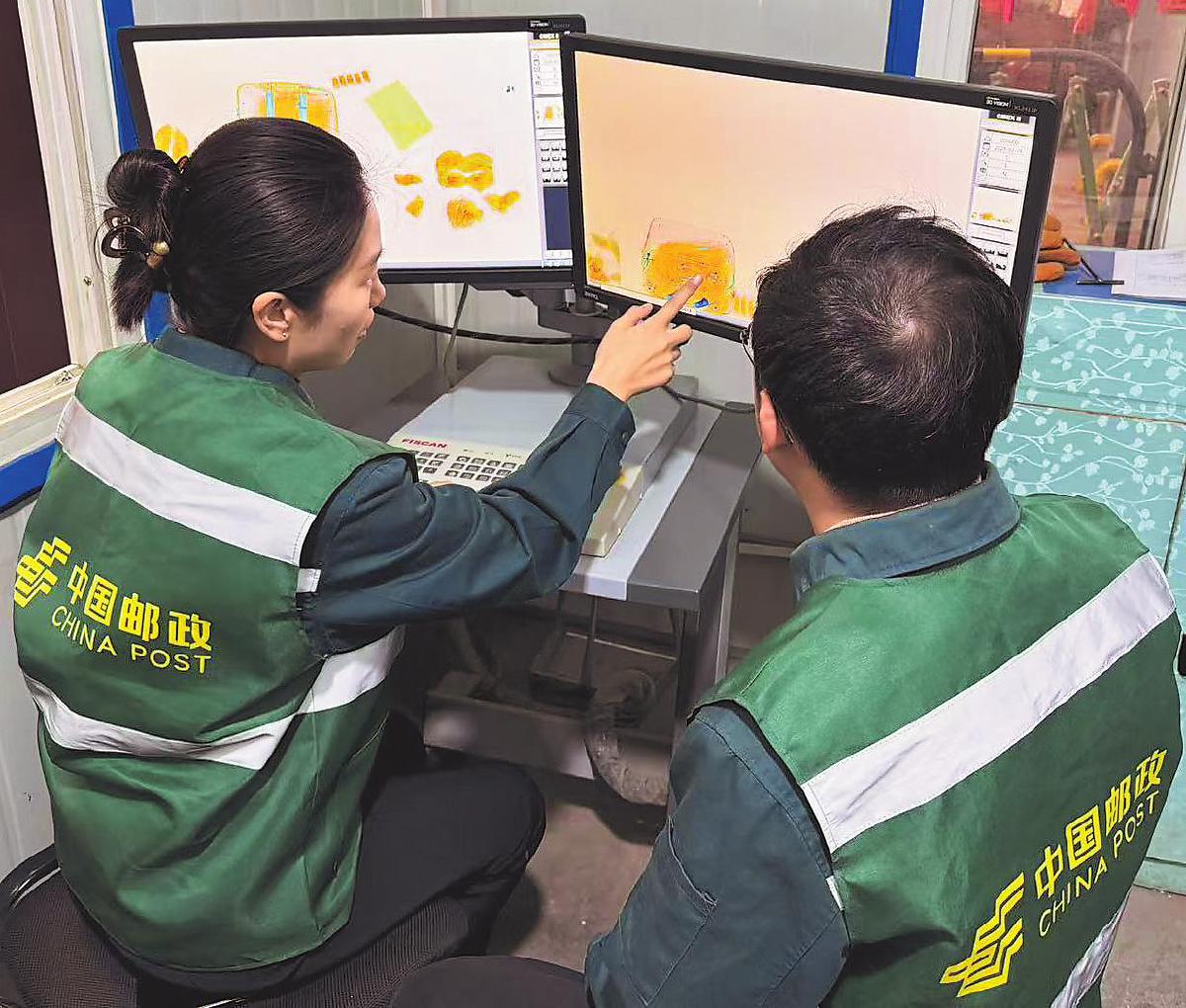 圖為濟(jì)南郵政工作人員對(duì)進(jìn)京郵件進(jìn)行二次過機(jī)安檢。