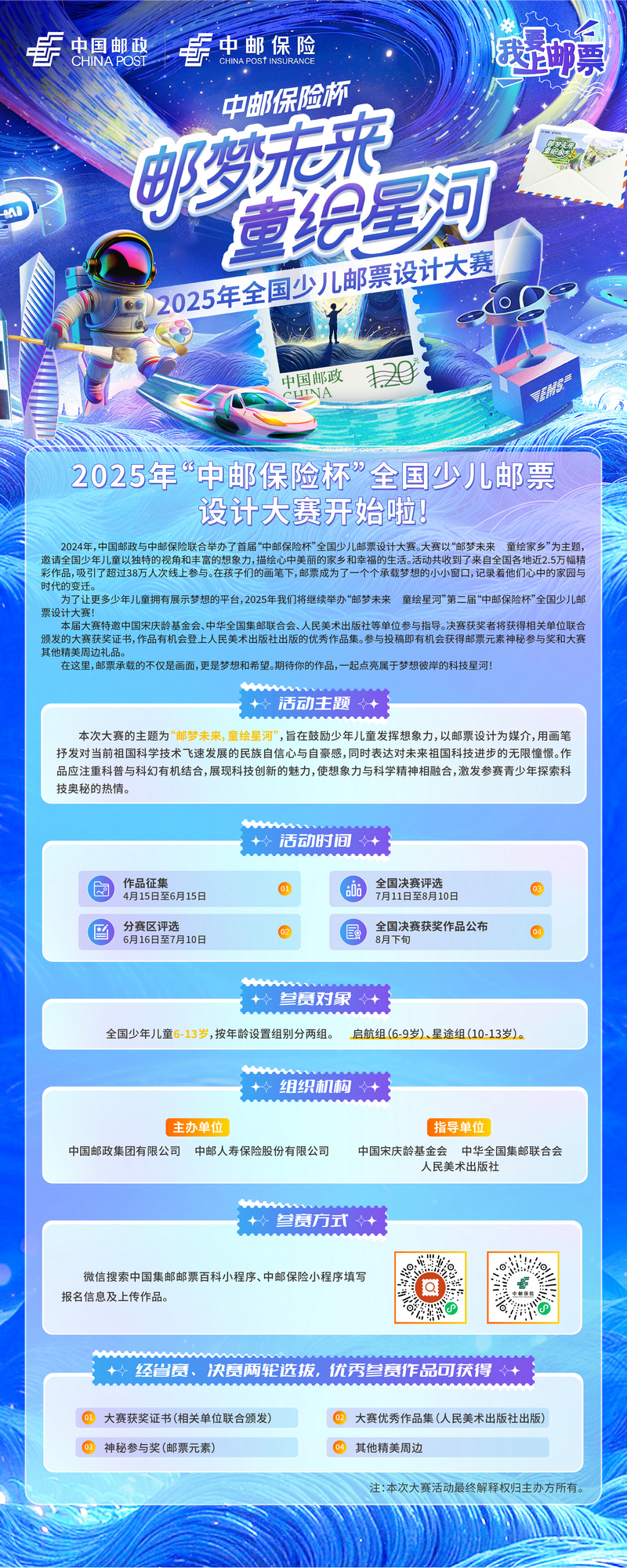 本次大賽的主題為“郵夢未來,童繪星河”,旨在鼓勵少年兒童發(fā)揮想象力,以郵票設計為媒介,用畫筆抒發(fā)對當前祖國科學技術(shù)飛速發(fā)展的民族自信心與自豪感,同時表達對未來祖國科技進步的無限憧憬。作品應注重科普與科幻有機結(jié)合,展現(xiàn)科技創(chuàng)新的魅力,使想象力與科學精神相融合,激發(fā)參賽青少年探索科技奧秘的熱情。