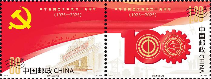 1925年5月1日,中華全國總工會在廣州正式成立。百年來,在黨的領(lǐng)導(dǎo)下,中華全國總工會櫛風(fēng)沐雨,始終與黨同心、跟黨奮斗,前赴后繼、奮勇拼搏,艱苦奮斗、建功立業(yè),譜寫了壯麗的篇章?!吨腥A全國總工會成立一百周年》紀(jì)念郵票圖案采用連票設(shè)計形式,以紅色為主色調(diào)。第一枚“億萬職工心向黨”,以黨徽、中華全國總工會廣州舊址為畫面主體,以意象化的紅旗為背景,并點綴心形圖案,象征中華全國總工會初心向黨,在黨的領(lǐng)導(dǎo)下走過百年光輝歷程。第二枚“團結(jié)奮斗新征程”,將中華全國總工會會徽、齒輪、芯片等與數(shù)字“100”組合設(shè)計,以意象化的紅旗為背景,并輔以城市建筑、港口、高鐵、飛機、火箭、空間站及勞動者等元素,象征著進入新時代以來,中華全國總工會在黨的領(lǐng)導(dǎo)下不斷奮進,為實現(xiàn)中華民族偉大復(fù)興作出更大貢獻。