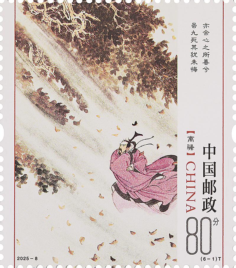 該套郵票采用中國傳統(tǒng)繪畫的表現(xiàn)形式,將《楚辭》語句與當代審美相融合,將工筆與寫意、高遠與平遠等創(chuàng)作手法相結合,郵票畫面構圖舒適,設色典雅,虛實相間,意境崇高,通過色調(diào)對比,把握設計節(jié)奏起伏,使整套票充盈著中文的韻味與楚文化的意涵。